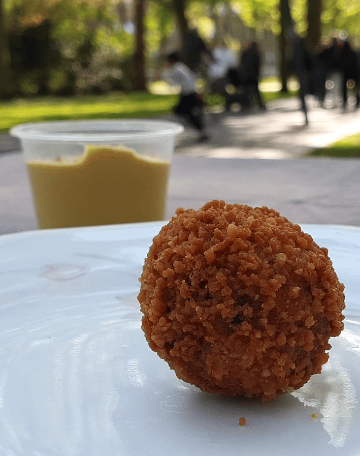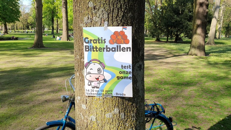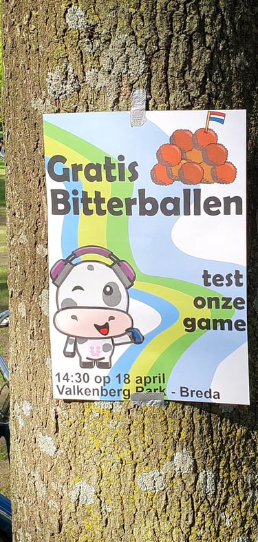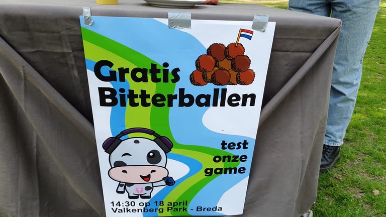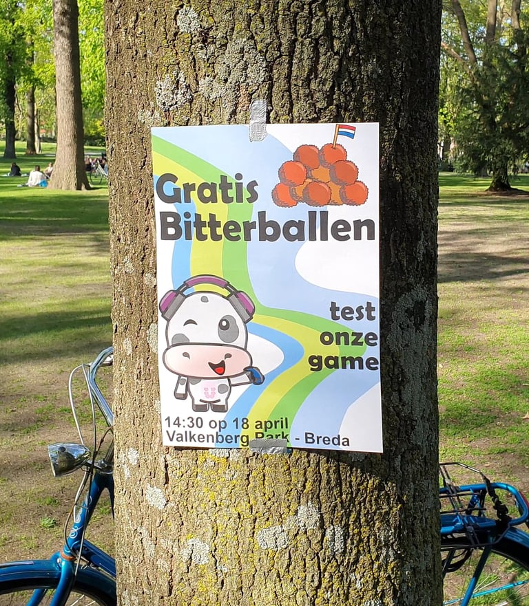 We set up in a park, where the user could come by and we'd give them a beef bitterball as a thank you for playing. While they were eating we gave them the phone with a game on it. They could customize and play with a cute cow. After playing for a bit and creating a connection with the cow, the real intervention would start. The screen would flash with a warning sign that the bitterballs were finished and a siren sound would play. Then their cow would be theatrically snatched away off-screen. We would thank them profusely because now we had bitterballs again and lay a new one down on the plate.
