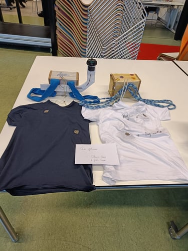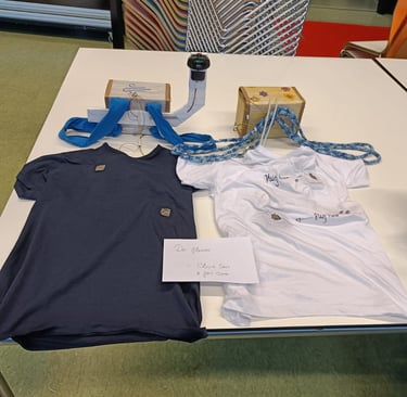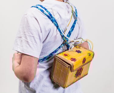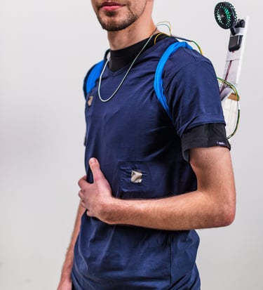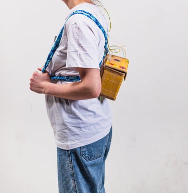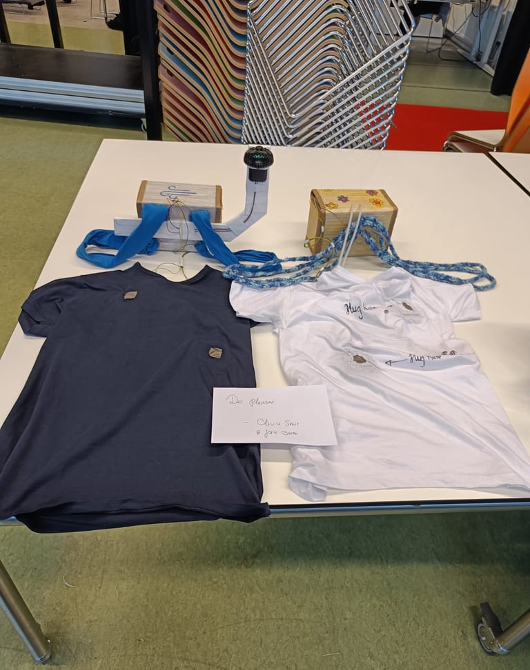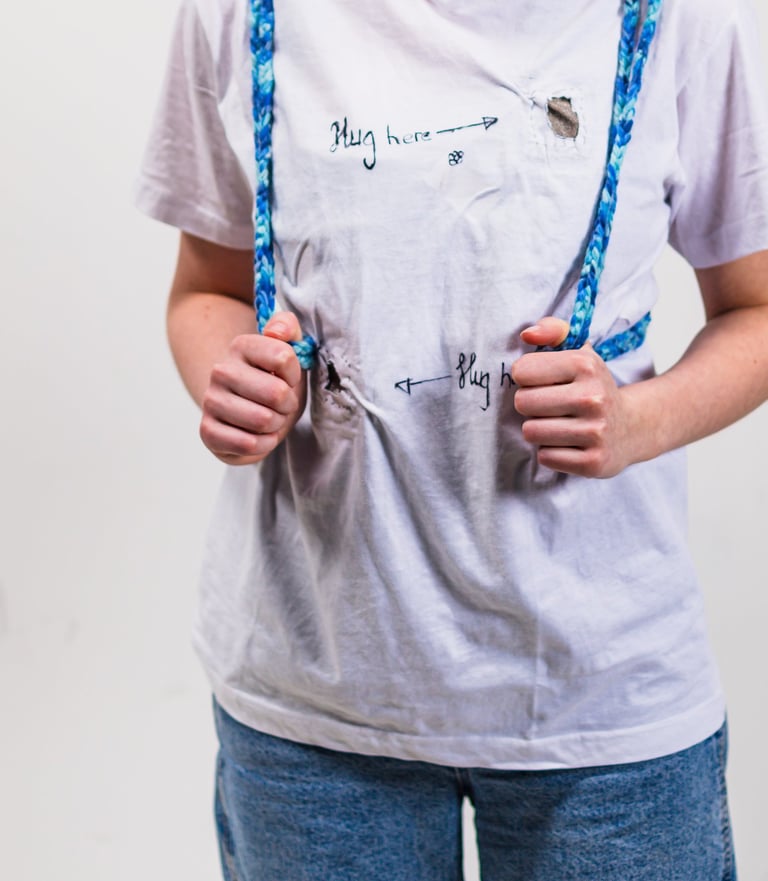 Similarly designed with pressure-sensitive conductive material on the customizable T-shirt and small bag. When hugged, an air pump releases a fresh scent into the air, making hugs more pleasant after hours of dancing.